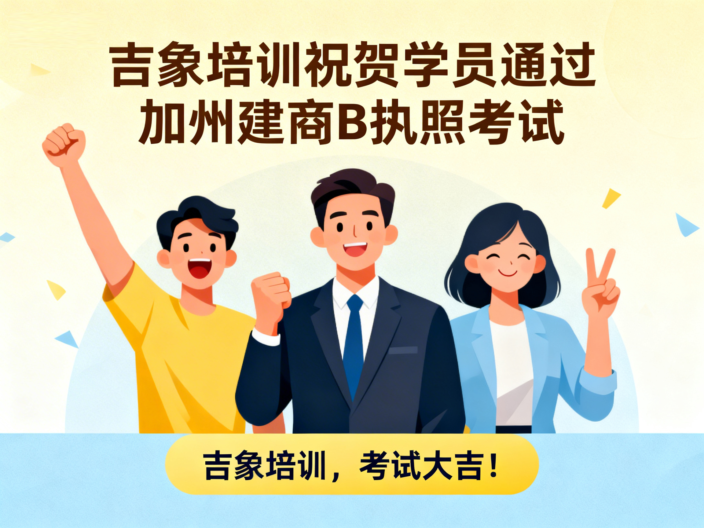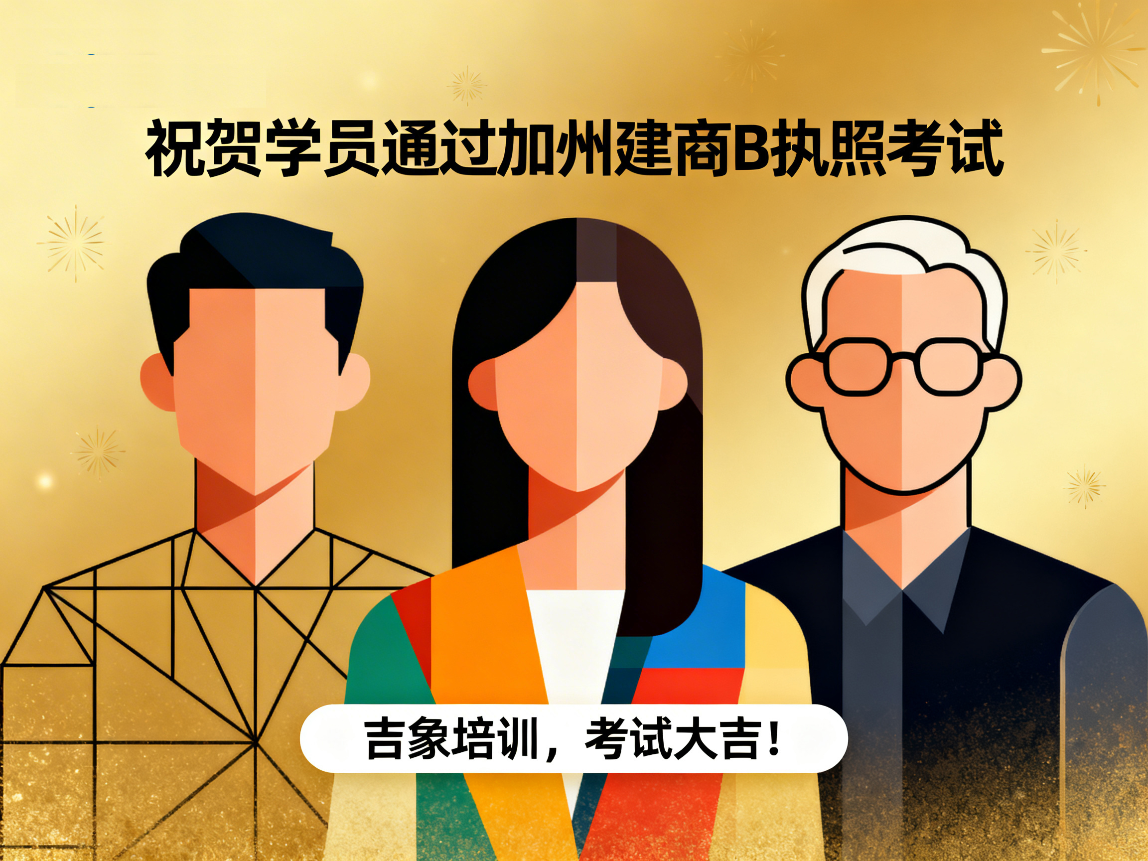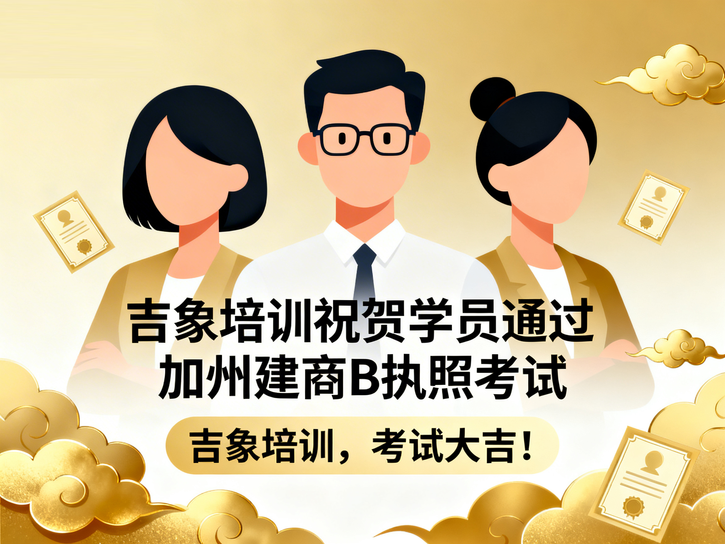 上周,吉象建筑执照培训中心再传捷报——学员 David Wang 顺利通过加利福尼亚州建商 B 类执照考试,正式迈入持证专业建筑承包人的行列。 这一优异成绩不仅体现了学员个人的努力与专业能力,也再次验证了吉象培训在建筑执照教育领域的教学质量与培训实力。 学以致用 · 专业指导助力成功 作为加州知名的建筑执照培训机构,吉象培训始终坚持以“实战教学、精准辅导、稳步取