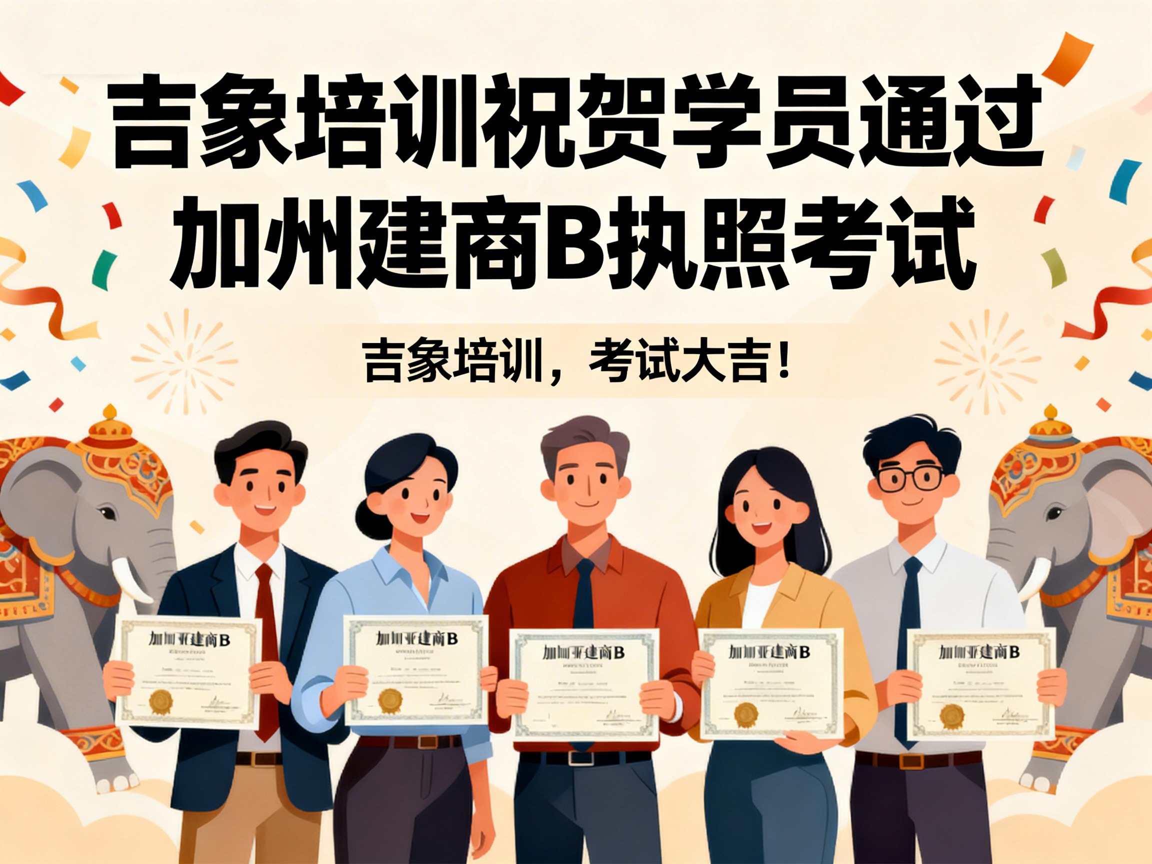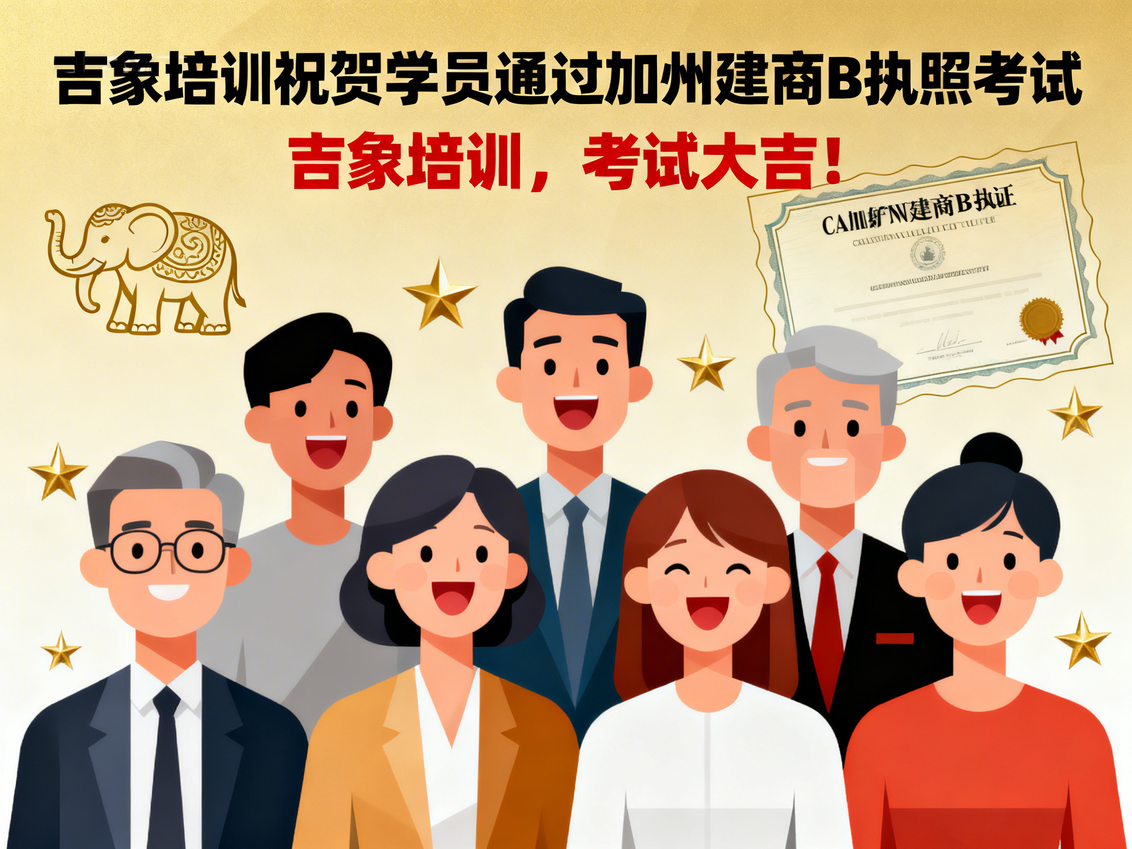 上周,吉象建筑执照培训中心再传捷报——学员 Gary Fan 顺利通过加利福尼亚州建商 B 类执照考试,正式迈入持证专业建筑承包人的行列。 这一优异成绩不仅体现了学员个人的努力与专业能力,也再次验证了吉象培训在建筑执照教育领域的教学质量与培训实力。 学以致用 · 专业指导助力成功 作为加州知名的建筑执照培训机构,吉象培训始终坚持以“实战教学、精准辅导、稳步取