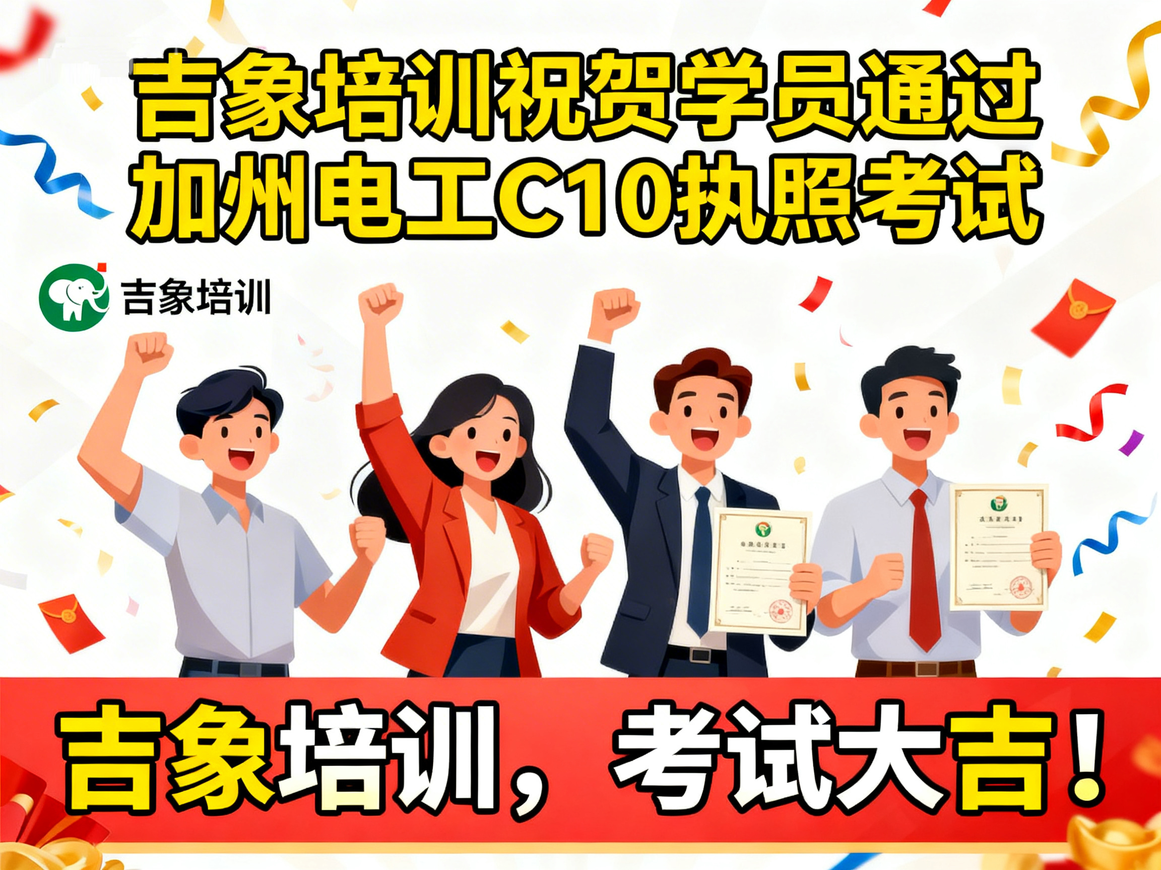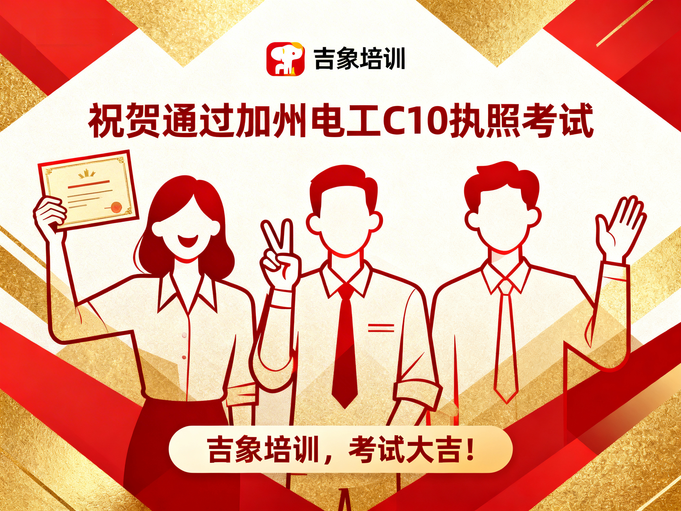 上周,吉象建筑执照培训中心再传捷报——学员 Eric Tan 顺利通过加利福尼亚州建商 B 类执照技术考试,正式迈入持证专业建筑承包人的行列。 这一优异成绩不仅体现了学员个人的努力与专业能力,也再次验证了吉象培训在建筑执照教育领域的教学质量与培训实力。 学以致用 · 专业指导助力成功 作为加州知名的建筑执照培训机构,吉象培训始终坚持以“实战教学、精准辅导、稳